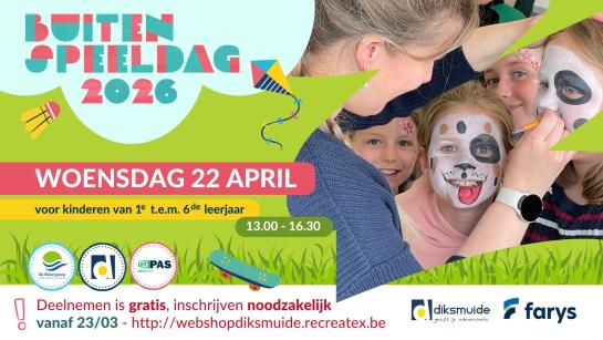 Zet woensdagnamiddag 22 april met stip in je agenda, want dan is het weer Buitenspeeldag! Het is dé dag waarop onze vrijetijdsdiensten het belang van buitenspelen en bewegen extra in de kijker willen zetten. Geen schermen, geen huiswerk, gewoon spelen, bewegen en plezier maken.
