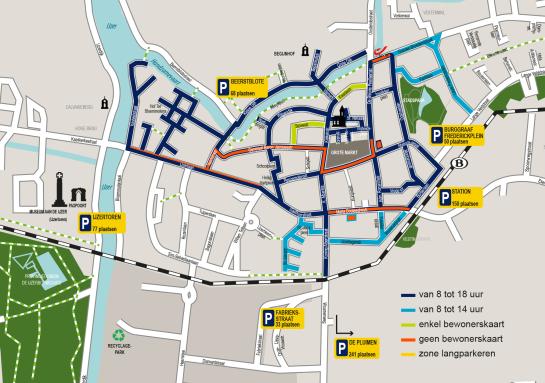 Het centrum van onze stad is grotendeels blauwe zone. Van 8 tot 18 uur kan je er twee uur parkeren als je je parkeerschijf legt, op zon- en feestdagen hoeft dat niet. In de lichtblauw gemarkeerde straten geldt de beperkte parkeertijd enkel tussen 8 en 14 uur en kan je vanaf 14 uur al onbeperkt parkeren.